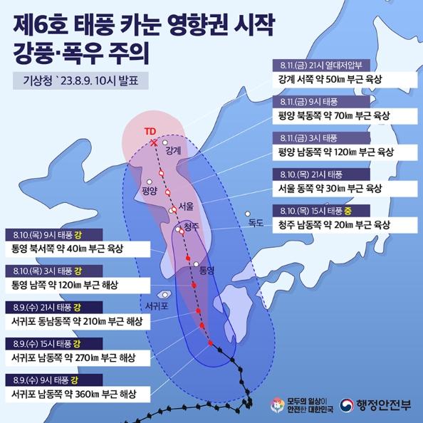 [한국쇼핑몰뉴스, 최영진기자] 전국이 태풍 ‘카눈’의?영향권에 들겠습니다.(기상청 ’23.8.9. 10시 발표)