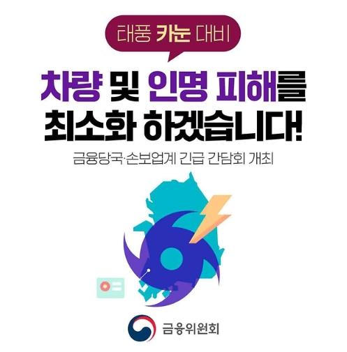 [한국쇼핑몰뉴스, 최영진기자] 금융위원회·금융감독원은 손보업계와 태풍 ‘카눈’의 한반도 관통에 따른 차량 및 인명 피해 최소화를 위한 대응방안 등을 논의했습니다.(금융당국·손보업계 긴급 간담회, 23.8.9.)