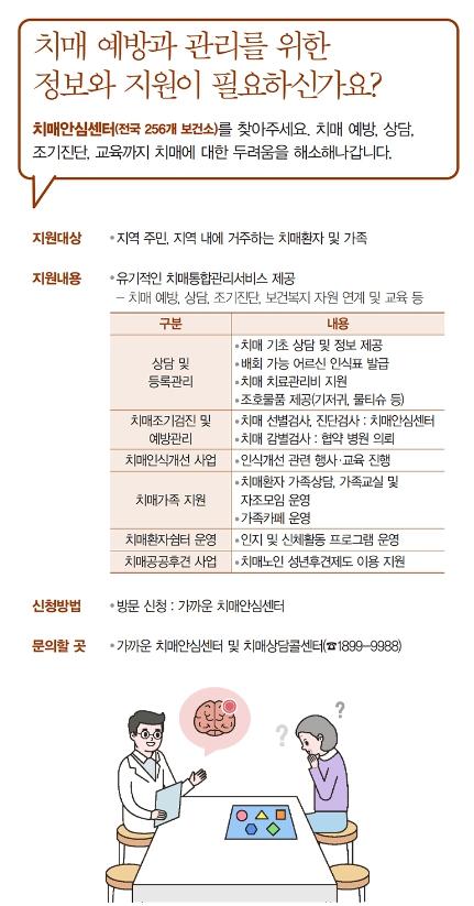 - 치매 예방, 상담, 조기진단, 보건복지 자원 연계 및 교육 등