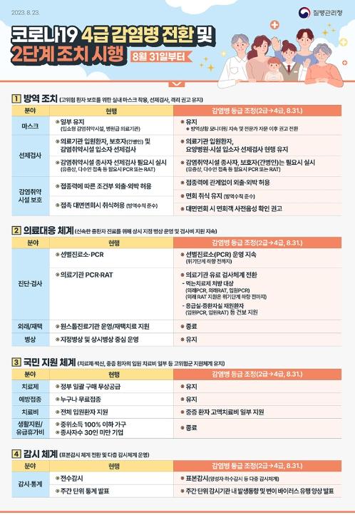 [한국쇼핑몰뉴스, 최영진기자] 8월 31일을 기점으로 코로나19를 4급 감염병으로 전환하고, 2단계 조치를 시행합니다.