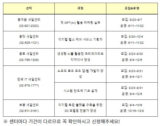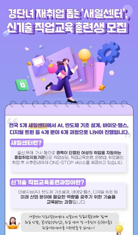 [한국쇼핑몰뉴스, 최영진기자] 경단녀 재취업 돕는 ‘새일센터’에서 신기술 직업교육 훈련생을 모집합니다. 전국 5개 새일센터에서 AI, 반도체 기초 설계, 바이오·헬스, 디지털 트윈 등 4개 분야 6개 과정으로 나뉘어 진행됩니다.