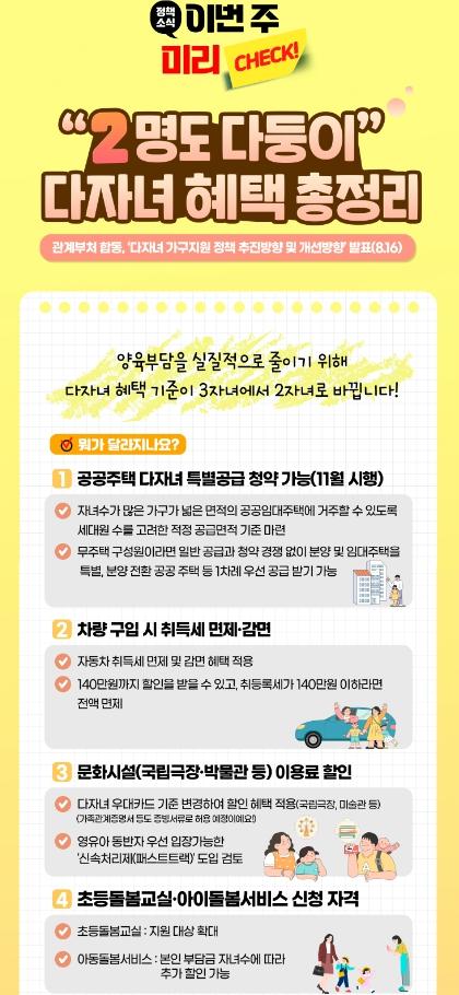 [한국쇼핑몰뉴스, 최영진기자] 양육부담을 실질적으로 줄이기 위해 다자녀 혜택 기준이 3자녀에서 2자녀로 바뀝니다!