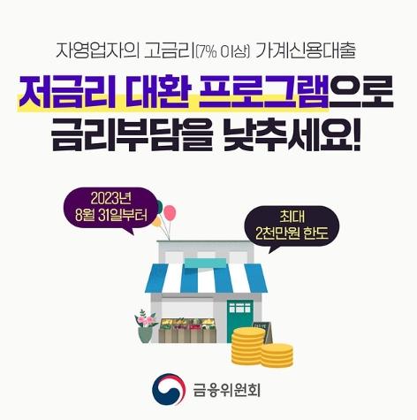 코로나19를 극복하는 과정에서 고금리 (7% 이상) 가계신용대출을 받아 사업용도로 지출한 자영업자들은 31일부터 저금리 대환 프로그램을 통해 저금리 대출(최대 5.5%)로 갈아탈 수 있습니다.