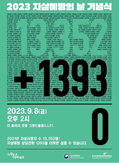 올해 12회를 맞는 이번 행사는 ‘살고 싶었던 13,352(‘21년 자살사망자 수) + 살릴 수 있는 1393(자살예방상담전화) = 0’을 주제로 자살사망자는 누구보다 살고 싶었던 사람이었으며, 우리 모두가 자살예방상담전화 1393을 기억하고 연결한다면 살릴 수 있다는 의미를 담았다.