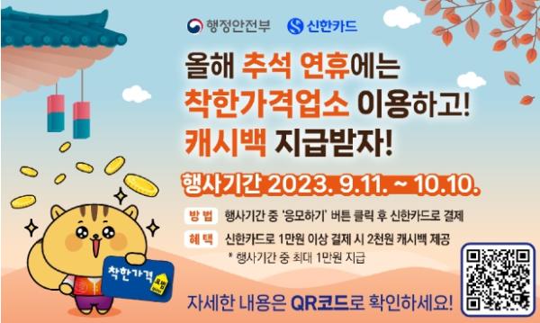 추석을 맞아 추진하는 이번 신한카드 연계 착한가격업소 이용 활성화 행사는 행사 기간 중 전국에 있는 착한가격업소(신한카드 가맹점 5천953개)에서 신한카드로 1만원 이상 결제 시 1회당 2천원 환급(캐시백)을 지급한다.