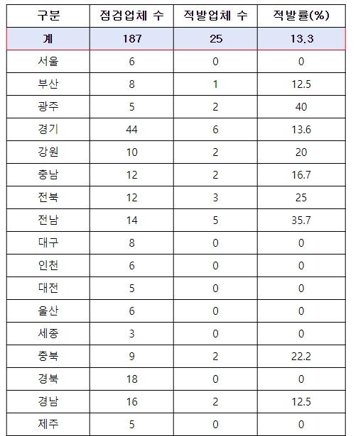 불법·부실 검사가 의심되는 검사소 187곳을 점검한 결과, 점검대상의 13.4%인 25곳을 적발했으며, 위반사항 중 외관검사의 검사항목을 일부 생략하는 경우가 대다수를 차지하는 것으로 나타났다.