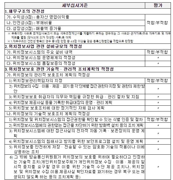 등록에 대한 적정성 검토는 총 3개 영역의 심사 항목을 평가하는 방식으로 진행되며, ▲등록신청 법인의 수익성·안정성 등을 평가하는 ‘재무구조의 건전성’, ▲위치정보시스템의 주요 설비 내역 등을 평가하는 ‘위치정보사업 관련 설비규모의 적정성’, ▲위치정보보호를 위한 각종 조치계획 등을 종합적으로 평가하는 ‘위치정보 보호 관련 기술적·관리적 조치계획의 적정성’으로 구성된다.