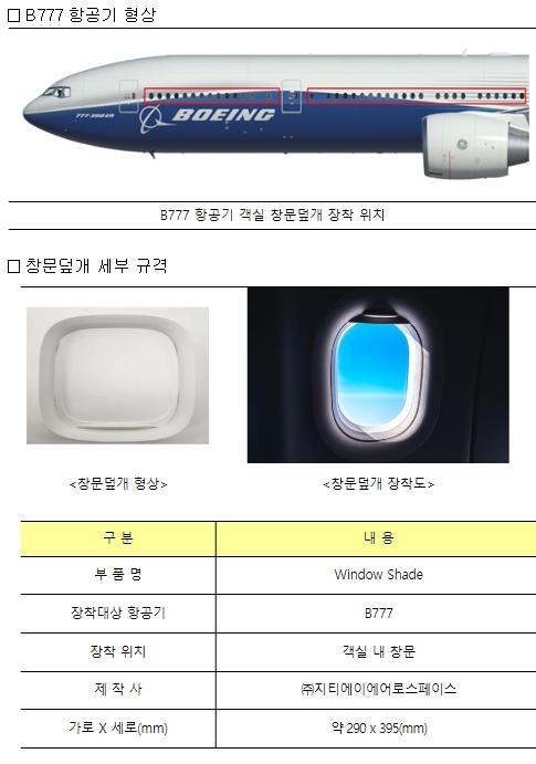 [한국쇼핑몰뉴스, 최영진기자] 국토교통부는 국내 중소업체인 ㈜지티에이에어로스페이스가 개발한 B777 항공기 객실 창문덮개(Window Shade)에 대해 안전성 인증을 완료(’24.1.12 국토부)하고 국내 항공사에 공급한다고 밝혔다.