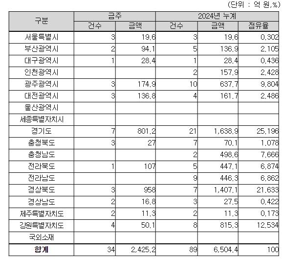 지역별로는 경상북도 958억 원, 경기도 801억 원, 광주광역시 175억 원, 그 밖의 지역이 491억 원이다.