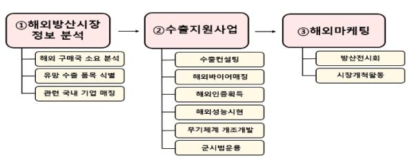 방위사업청은 해외시장 분석을 통해 수출 유망한 기술 및 품목을 선제적으로 식별한 후 이와 관련된 국내기업을 발굴하여 지원하는 방식을 추가적으로 도입한다.