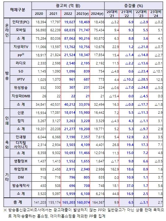 한편, 2023년 전체 광고비는 미국발 고금리, 경제 성장 둔화 영향으로 16조 74억 원(’22년 대비 △5,129억 원 감소)으로 집계될 것으로 예상된다.
