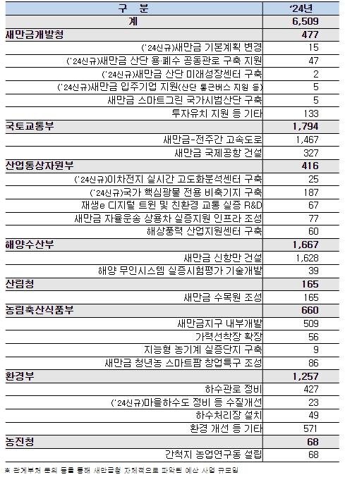 해양수산부는 신항만 건설 1단계(2선석) 사업(1,628억 원)이 마무리될 수 있도록 추진할 예정이며, 산림청은 새만금 수목원 조성사업(165억 원)을 위해 적정 예산을 편성했다.