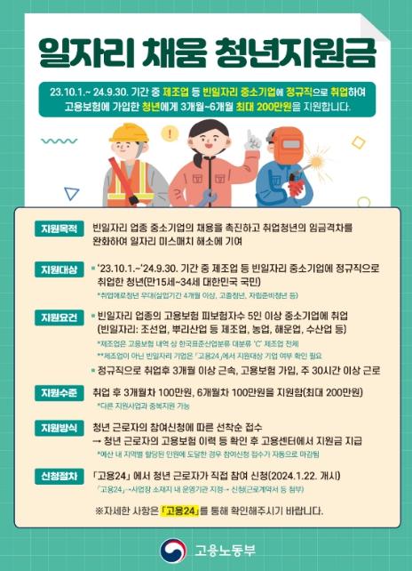 지원 대상은 만15~34세 청년 중 ①제조업 중소기업(고용보험 피보험자 수 5인 이상 우선지원대상기업)에 ②’23.10.1. 이후 정규직으로 취업(주 30시간 이상)하여 ③3개월 이상 근속한 근로자이다. 해당 청년은 누리집 ?고용24?에 지원금을 신청할 수 있으며, 3개월·6개월 차에 각 100만 원씩 총 200만 원을 직접 계좌로 지급받는다.