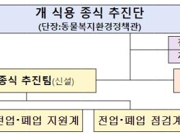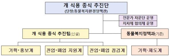 ‘개 식용 종식 추진단’은 농식품부 동물복지환경정책관을 단장으로 농식품부·산하기관·지자체·전문가 등으로 구성된 ‘개 식용 종식 추진팀’을 신설하고, 그동안 ?개 식용 종식 로드맵? 마련 및 ?개 식용 종식 특별법? 제정 등을 추진한 동물복지정책과도 포함시켰다.