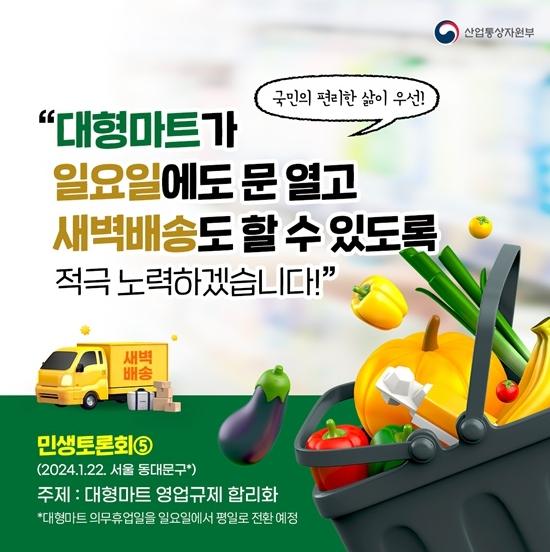 “정부는 의무휴업 공휴일 지정 원칙을 삭제하는 내용의 유통법 개정을 추진해 의무휴업 평일 전환을 가속화하고, 대형마트 온라인 배송을 허용하는 유통법 개정안이 통과되도록 국회 협의를 지속해 새벽배송 가능 지역을 확대해 나가겠습니다.”