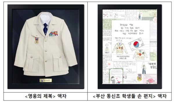 ‘영웅의 제복’ 액자는 6·25참전용사들에게 지급된 베이지색 상의와 남색 넥타이로 구성된 제복을 액자(가로 90cm, 세로 100cm)에 넣은 것으로, 강정애 장관은 이날 ‘영웅의 제복’ 액자와 함께 부산 동신초등학교 학생들이 “6·25 참전용사들을 위한 명예 제복을 무상으로 지급해달라”며 지난 2022년 7월 국가보훈부 장관에게 썼던 손 편지를 담은 액자도 함께 헌정할 예정이다.