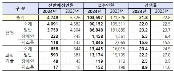 인사혁신처는 지난 18~22일 국가공무원 9급 공채 선발시험 원서를 접수한 결과, 선발예정인원 4,749명에 총 10만 3,597명이 지원해 21.8:1의 경쟁률을 기록했다고 25일 밝혔다.