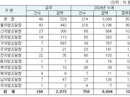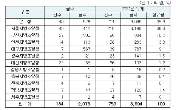 지역별 발주량을 보면 대전광역시 소재 본청 529억 원, 서울지방청 442억 원 등 2개청(971억 원)이 전체 금액(2,073억 원)의 46.8%를 차지하고 있으며, 인천 등 나머지 10개 지방청 1,102억 원이 각각 집행될 예정이다.