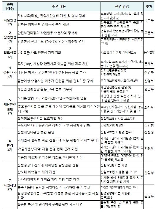 박명균 예방정책국장은 “정부는 관계기관 간 협업을 통해 국민 생활과 밀접한 의미 있는 개선과제가 발굴된 만큼 제도개선 추진상황을 지속적으로 점검하여 조기에 이행될 수 있도록 만전을 기하겠다”라며, “앞으로도 국민 생활에 안전 사각지대가 발생하지 않도록 일선 현장의 의견을 적극 수렴하고 관계부처와 함께 제도개선을 지속 추진해 나가겠다”라고 밝혔다.