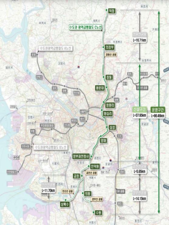 GTX-C는 경기도 양주시 덕정역을 출발하여 청량리, 삼성역 등을 지나 경기도 수원시 수원역까지 86.46km를 연결하는데, 14개 정거장 모두 일반 지하철로 갈아탈 수 있는 환승역이다. 향후 5년간 총사업비 4조 6,084억원이 투입된다.