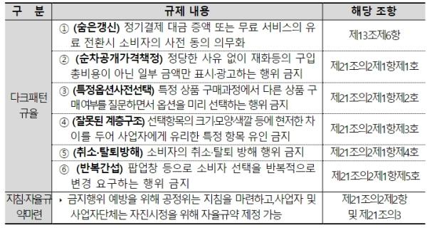 먼저, 이번에 개정된 전자상거래법에는 그간 소비자 피해가 다수 발생했으나, 현행법으로 규율이 어려워 입법 공백이 발생했던 6개 유형의 온라인 다크패턴에 대한 규제 내용 및 사업자 등의 자율규약 마련 등이 포함됐다.