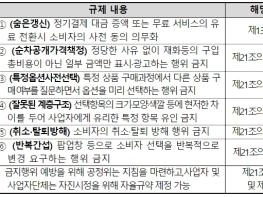 ② 전자상거래 사업자 또는 통신판매업자에게 온라인 인터페이스를 운영함에 있어 소비자의 착각·부주의를 유발하여 불필요한 지출 또는 서비스 가입 등을 유도하는 5개 유형의 행위를 금지했다.