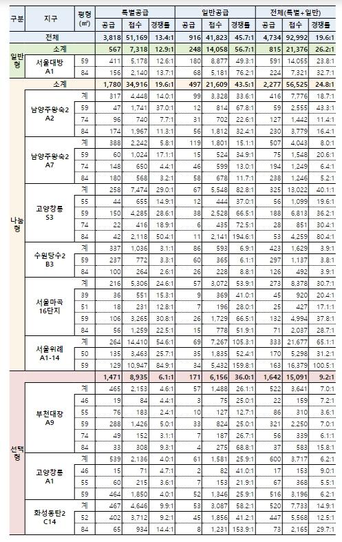 지역별로는 서울 위례 65.1대 1, 고양창릉(나눔) 40.1대 1, 서울 마곡 30.7대 1 등의 경쟁률을 기록했으며, 특히 서울 위례 59㎡ 일반공급 159.8대 1, 서울대방 84㎡ 일반공급이 76.2대 1, 서울마곡 59㎡ 일반공급이 66.5대 1을 기록하며 높은 경쟁률을 보였다.
