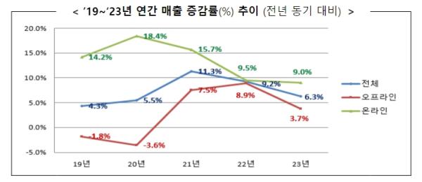 오프라인은 대형마트(0.5%), 백화점(2.2%), 편의점(8.1%), 준대규모점포(3.7%) 등 전 업태에서 증가세를 보이면서 매출이 3.7% 증가했고, 온라인도 매출이 9.0% 증가했다. 다만, 코로나 이후 일상회복의 영향으로 줄어들었던 온·오프라인의 매출 증가폭 차이는 다시 벌어지는 것으로 나타났다.
