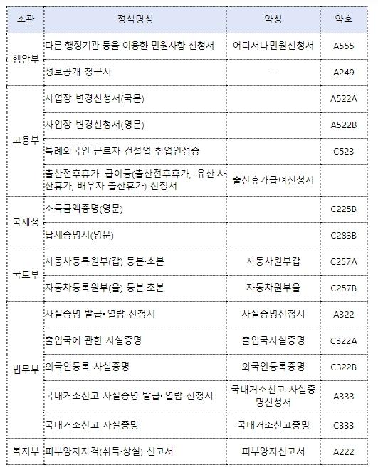 ② 서식의 명칭이 유사하거나, 주로 외국인이 많이 사용하는 행정서식들 위주로 한글을 잘 몰라도 쉽게 사용할 수 있도록 약호를 부여한다.
