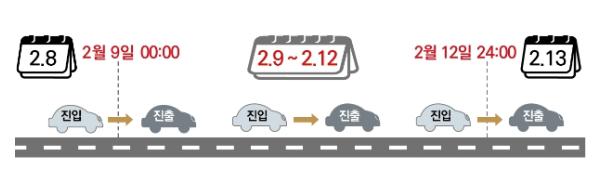 통행료 면제 기간 및 대상은 2월 9일 00시 새벽부터 2월 12일 24시 자정까지 잠시라도 고속도로를 이용하는 차량으로, 2월 9일 새벽에 고속도로를 진출한 경우 또는 2월 12일 밤에 고속도로에 진입한 경우도 면제 대상에 해당된다.