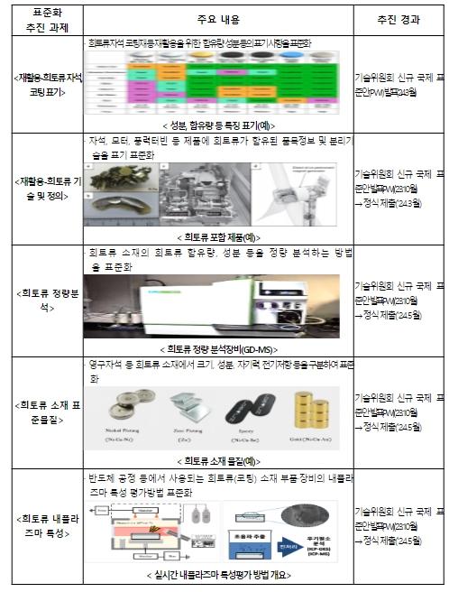 국표원에서는 동 전략에 따라 희토류 정량분석 방법, 내플라즈마 특성평가 방법, 희토류 재활용을 위한 성분표시 사항 등을 지난 10월 인천에서 개최된 희토류 국제표준화 회의(ISO/TC 298)에서 신규 국제표준안(PWI)으로 발표하는 등 총 5건의 국제표준 개발을 추진 중이다.