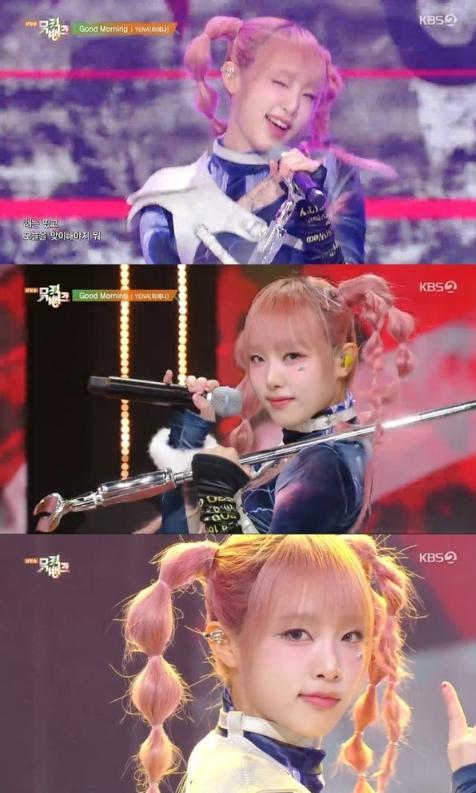 최예나는 2일 방송된 KBS 2TV ‘뮤직뱅크’에 출연해 세 번째 미니앨범 ‘GOOD MORNING(굿모닝)’의 동명의 타이틀곡 ‘Good Morning(굿모닝)’ 무대를 선보였다.