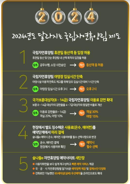 2024년 한해 국립자연휴양림은 안전하고 품질높은 휴양환경을 조성해 나간다는 업무방향을 설정하고, 이용객 편의를 고려한 제도 개선으로 국민들에게 한 걸음 더 가까이 다가갈 계획이다. 새롭게 바뀌는 주요 국립자연휴양림 정책은 다음과 같다.