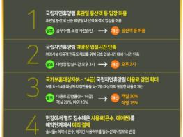 첫째, 국민들이 언제든 산림휴양 혜택을 누릴 수 있게 된다. 전국 46개 국립자연휴양림은 휴관일(화요일)에도 등산객의 입장을 허용한다. 기존에는 공무수행 목적으로 사전 승인을 받은 일부 기관?단체에만 입장을 허용하였으나, 국민 편의를 고려하여 등산과 산책을 목적으로 하는 개인도 입장이 가능하다.