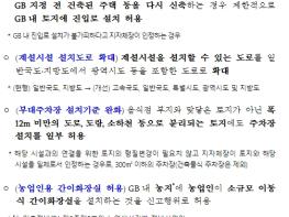 또한, GB로 지정됐다가 주민 집단취락으로 GB가 해제된 지역에서 GB 지정 전부터 있던 주택 및 근린생활시설을 신축하려는 경우, 인접한 GB 토지를 이용하여 진입로를 설치할 수 있게 된다.