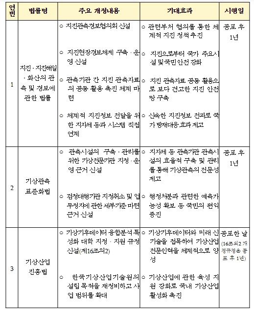 먼저, ‘지진관측법’은 작년 12월 경주지진, 올해 1월 동해안 지진해일 등 최근 잇따른 국내외의 지진 및 지진해일 발생으로 국민 불안이 고조된 상황에서 시의적절하게 개정됨에 따라, 국민 안전을 위한 지진 피해 예방과 대비 체계를 한층 강화할 수 있게 됐다.