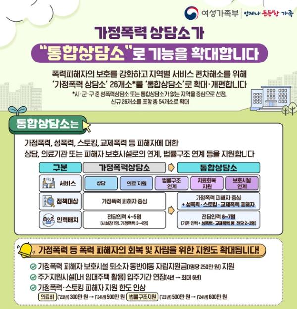 [한국쇼핑몰뉴스, 최영진기자] 폭력피해자의 보호를 강화하고 지역별 서비스 편차해소를 위해 ‘가정폭력 상담소’ 26개소*를 ‘통합상담소’로 확대·개편합니다.