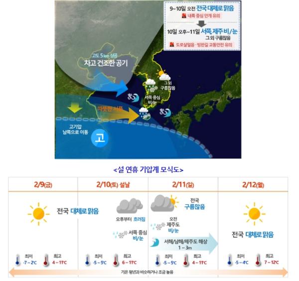 [한국쇼핑몰뉴스, 최영진기자] 기상청은 국민 생활 안전과 편의를 위해 설 연휴 기간인 2월 9일부터 12일까지에 대한 기상 전망을 발표했다.
