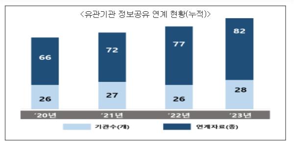 서비스 시행 초기에는 활용 범위가 행정안전부, 국방부 등에 한정되어 있었으나 현재는 공단, 진흥원과 같은 공공기관까지 연계범위를 확대하고 있다. 그 결과 ’23년 말 기준 28개 부처 및 공공기관과 82종의 자료를 연계하여 공동 활용하고 있다.