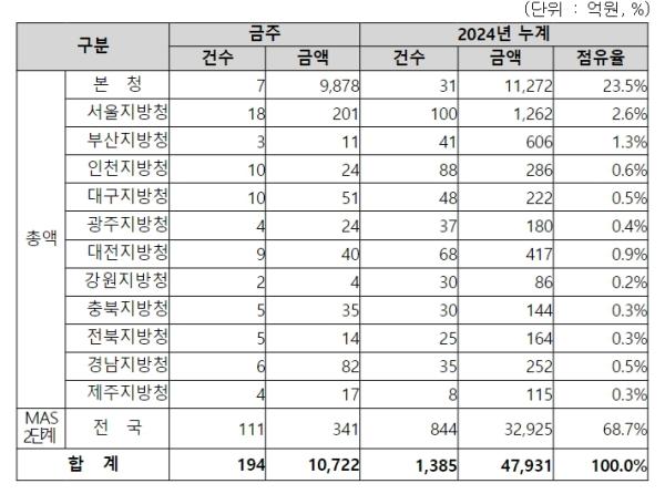지역별 발주량을 보면, 총액계약 대상 10,381억 원 중 본청이 9,878억 원으로 95.2%를 집행하고 서울청 등 11개 지방청에서 503억 원을 각각 집행할 예정이다.