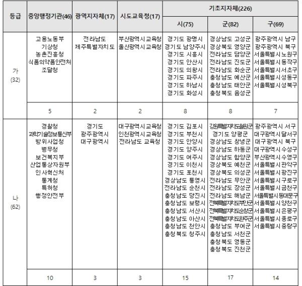 평가는 중앙행정기관, 광역지방자치단체, 교육청, 기초 시·군·구 등 6개 기관유형별로 구분하여 추진됐으며, 상위 10%에 해당하는 32개 기관이 우수기관(가등급)으로 선정됐다.