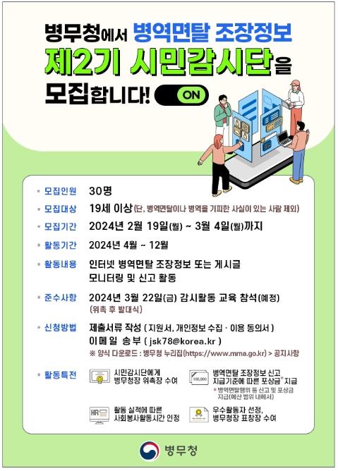 [한국쇼핑몰뉴스, 최영진기자] 병무청은 온라인상의 병역면탈 조장정보를 차단하여 공정한 병역이행 문화를 조성하기 위해 ‘제2기 병역면탈 조장정보 시민감시단’을 공개 모집한다.