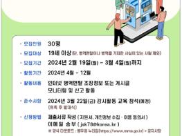 모집 기간은 2월 19일부터 3월 4일까지이며, 모집인원은 30명으로 병역면탈 예방활동에 관심이 있는 19세 이상이면 누구나 지원 가능하다. 지원 방법은 병무청 누리집(공지사항)에 게시된 지원서 등을 작성하여 전자우편으로 제출하면 된다.