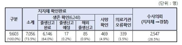 지자체가 확인한 건은 총 7,056명으로, 이 중 6,248명은 생존이 확인되어 원가정 양육, 입양 등의 형태로 지내고 있는 것으로 확인됐다. 사망한 아동은 469명, 의료기관오류는 339명이 확인됐다.