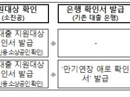신청이 접수되면 소진공은 중?저신용 소상공인 여부를 확인하여 ‘대환대출 지원대상 확인서’를 발급(온·오프라인)하고, 소상공인은 해당 확인서를 지참한 후 대환대출 취급은행에 방문하여 대환대출을 신청하면 된다.