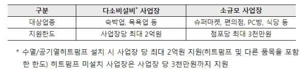 또한 200억원의 예산을 투입하여 수열/공기열히트펌프, LED 조명 등 공사가 필요한 설비를 교체 또는 신규 설치하는 경우 설치비의 70%를 지원할 예정이며, 구체적인 지원조건 및 신청방법 등은 한국에너지공단 누리집을 통해 공고될 예정이다. 관련 사항은 한국에너지공단 수요정책실로 문의하면 된다.