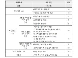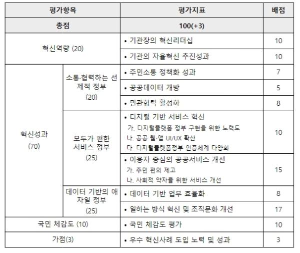 2023년에는 혁신역량, 혁신성과, 국민체감도 등 3개 평가 항목, 10개 세부지표를 대상으로 전문가 등으로 구성된 지방자치단체 혁신평가단이 평가를 실시했다.