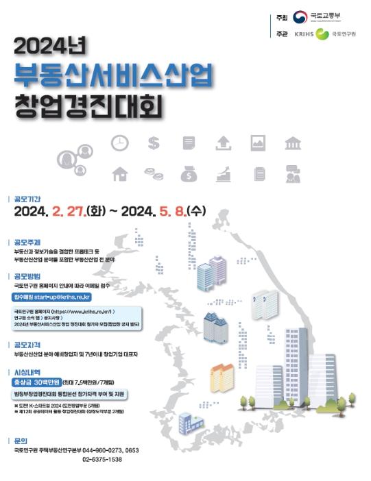 [한국쇼핑몰뉴스, 최영진기자] 부동산과 최신 정보기술을 결합한 우수한 아이디어를 발굴하고 부동산서비스 산업 분야 새싹기업을 지원하기 위한 ?2024 부동산서비스산업 창업경진대회?가 열린다.