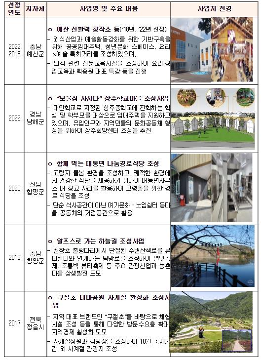 공모는 투자선도지구와 지역수요맞춤지원 사업으로 구분되며, ’15년부터 현재까지 남원주 역세권 개발사업(원주시), 예산시장 신활력창작소(예산군) 등 185개의 특화된 사업을 선정하여 지원해 오고 있다.