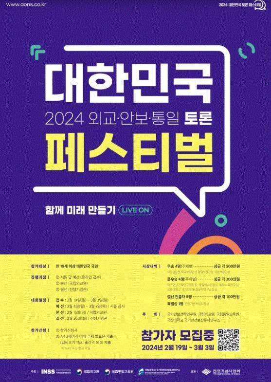 [한국쇼핑몰뉴스, 최영진기자] 국가안보전략연구원, 국립외교원, 국립통일교육원, 국방대학교 국가안전보장문제연구소가 공동 개최하는 '2024 대한민국 외교·안보·통일 토론 페스티벌'이 3월 개최된다. 외교안보 유관기관들이 뜻을 모아 공동으로 기획·진행하는 이번 행사는 만 19세 이상 대한민국 국민이면 누구나 참여 가능하며, 3월 3일까지 홈페이지를 통하여 신청할 수 있다. 우리나라의 외교·안보·통일 현안에 관심있는 국민들이 많이 참여하여 풍성한 토론의 장이 마련될 것으로 기대된다.